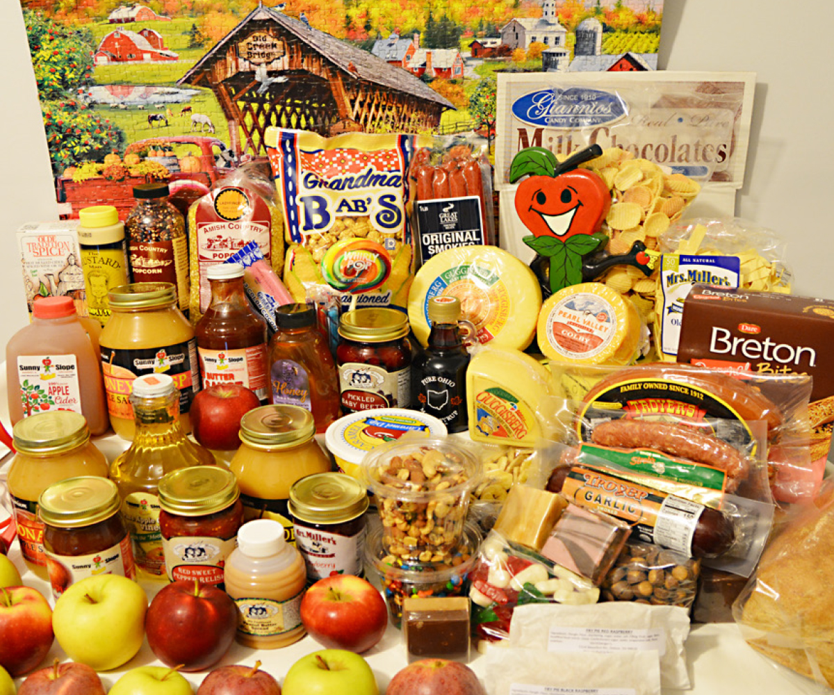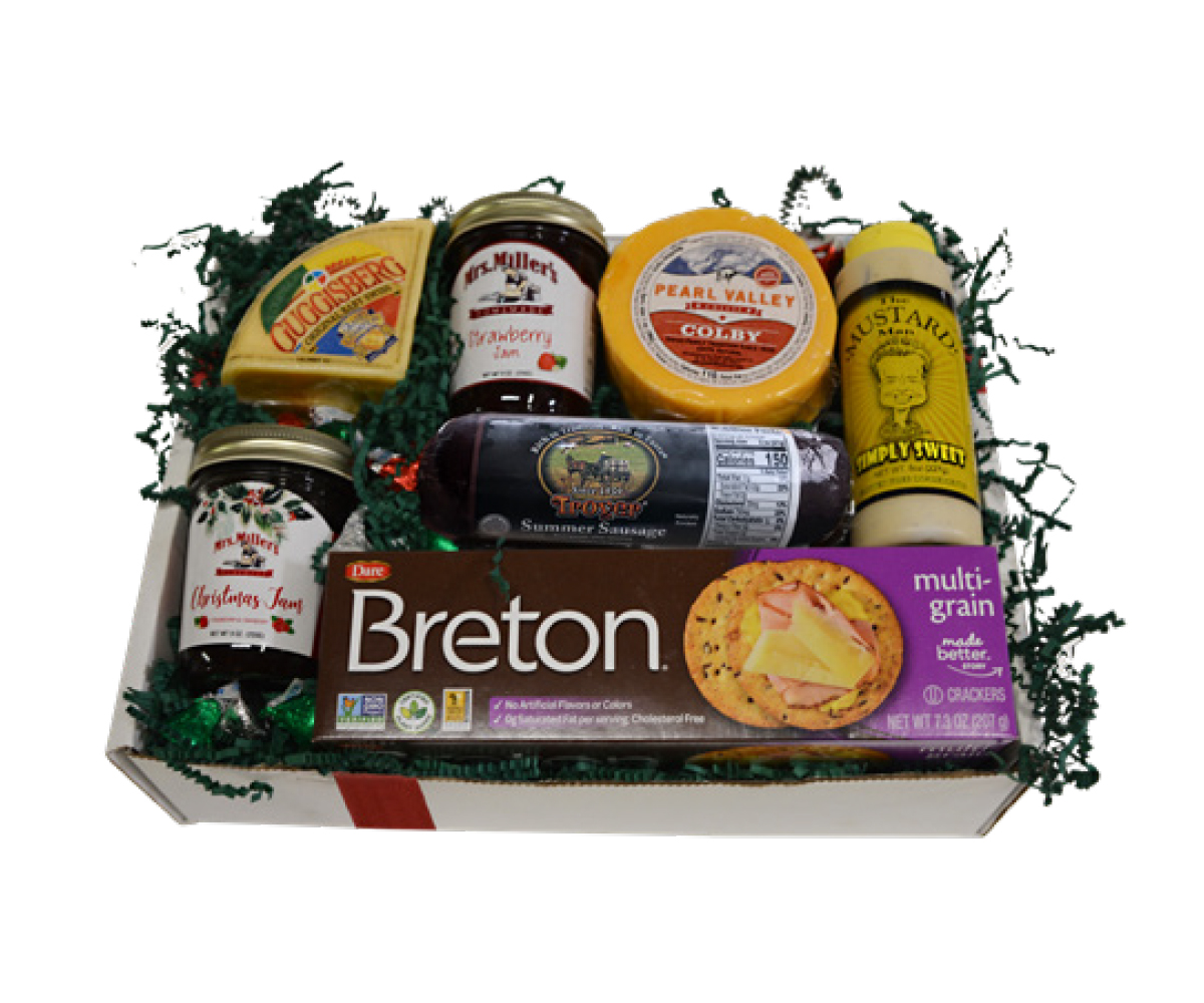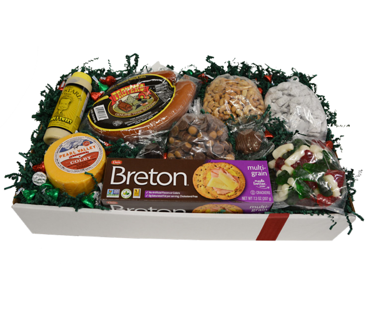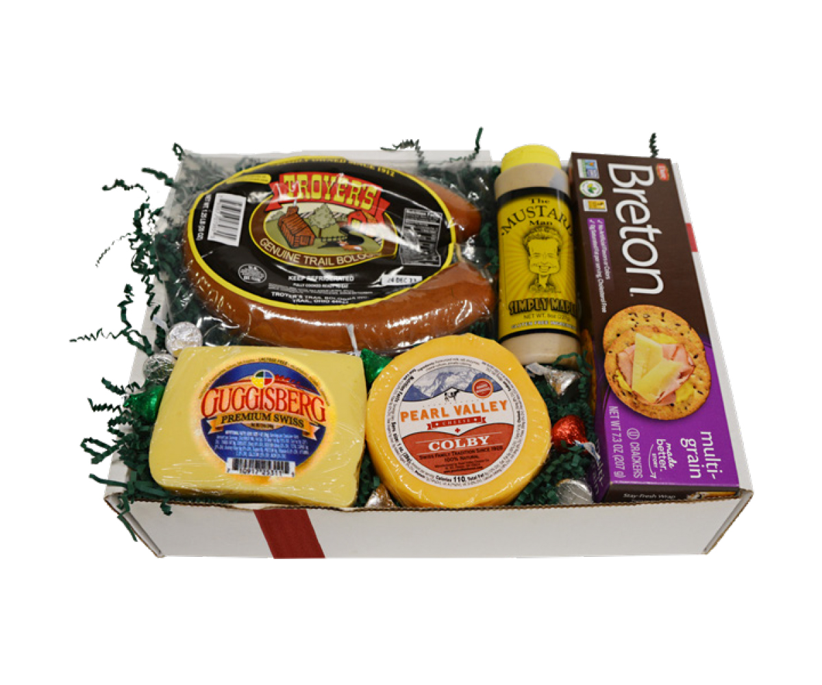 Trail Bologna, Swiss Cheese, Colby Cheese, Pancake Mix, Maple Syrup, Apple Butter, Honey, 2 – 9 oz. Jams, Mustard Man Mustard, Sprinkled with Hershey’s Kisses