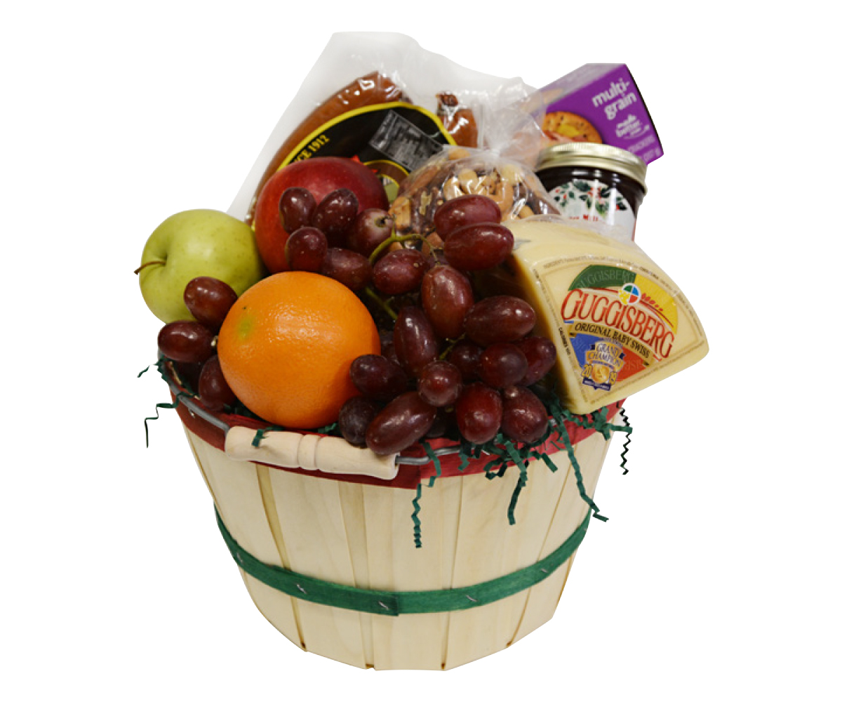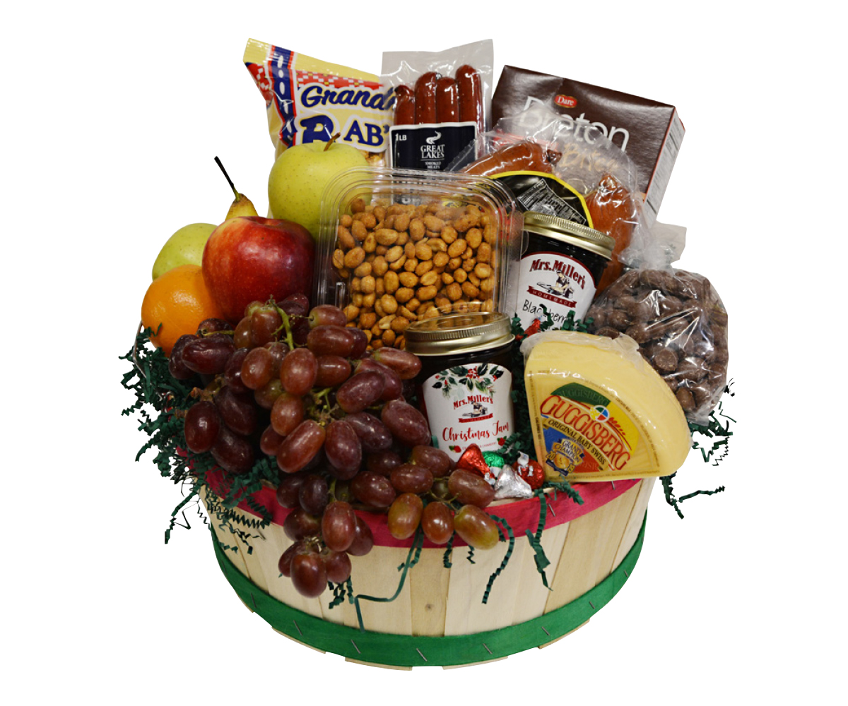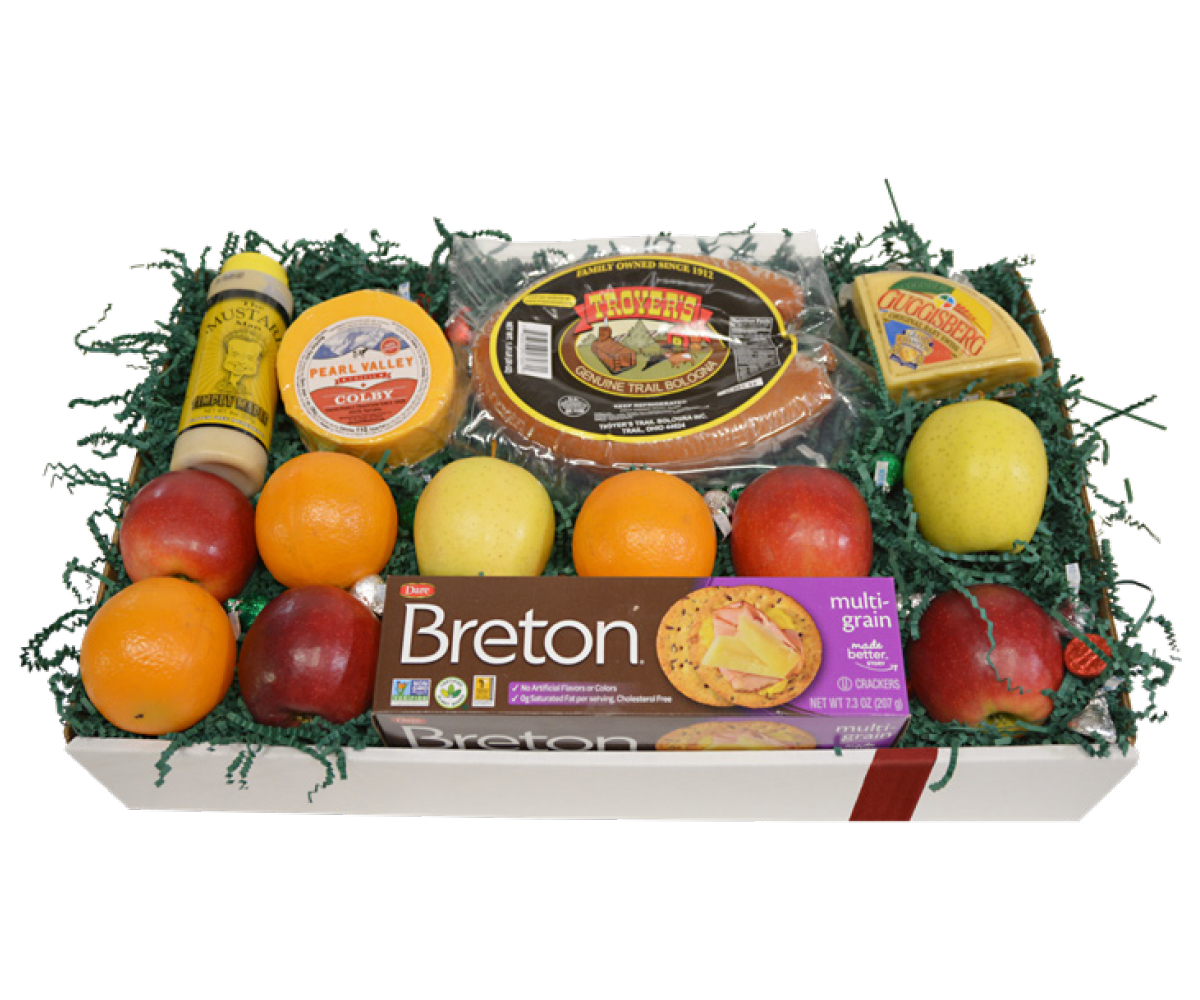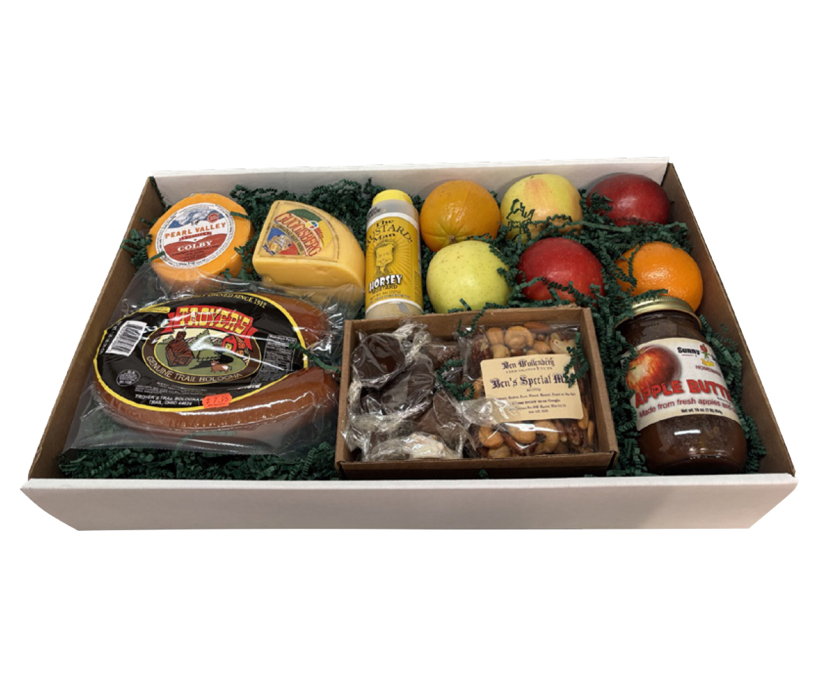 1 pt. Apple Butter, Chocolates & Nuts, Mustard, 6 Fruit, 2 – Cheese Pucks, Trail Bologna