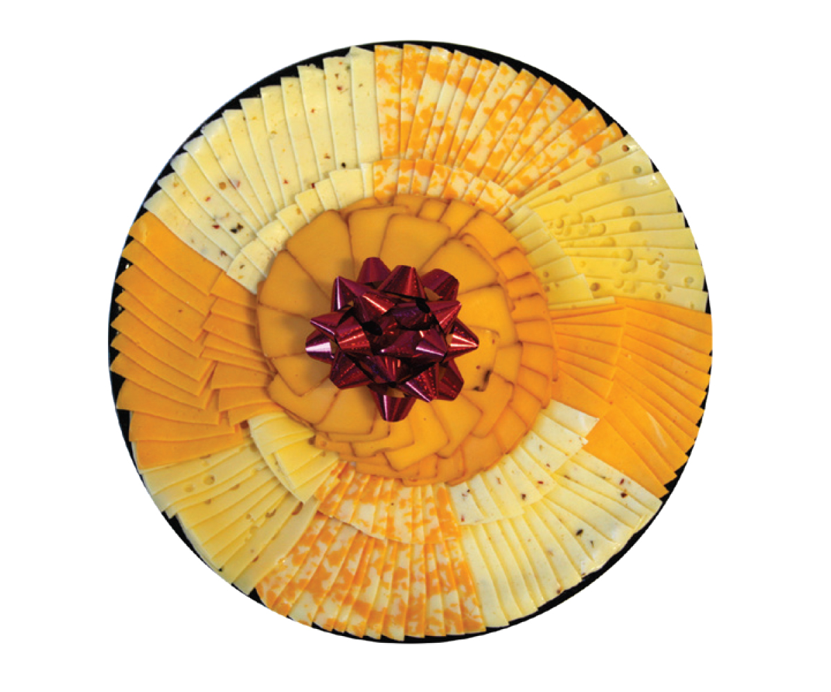 Breton Crackers, 1 Colby Cheese, Mustard, 1 lb. Swiss Cheese, Trail Bologna, 12 Fruit, Sprinkled with Hershey’s Kisses